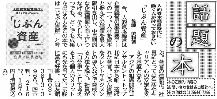 2025年12月5日(金)発行『人的資本経営時代に働く人が持っておきたい「じぶん資産」』が「日刊工業新聞」の「話題の本」コーナーに書評が掲載されました。